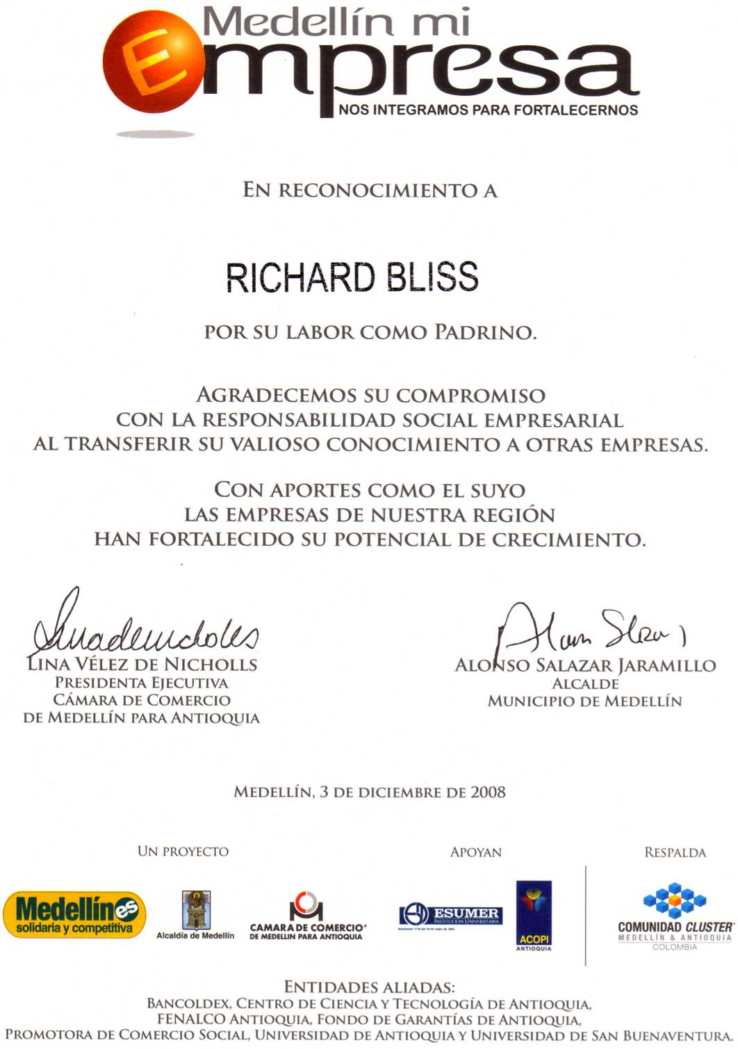 - Nombrado Padrino Empresarial de Medellín por el Alcalde Alonso Salazar J. y la Presidente de la Cámara de Comercio Lina Vélez de Nicholl’s SC. – 2008;